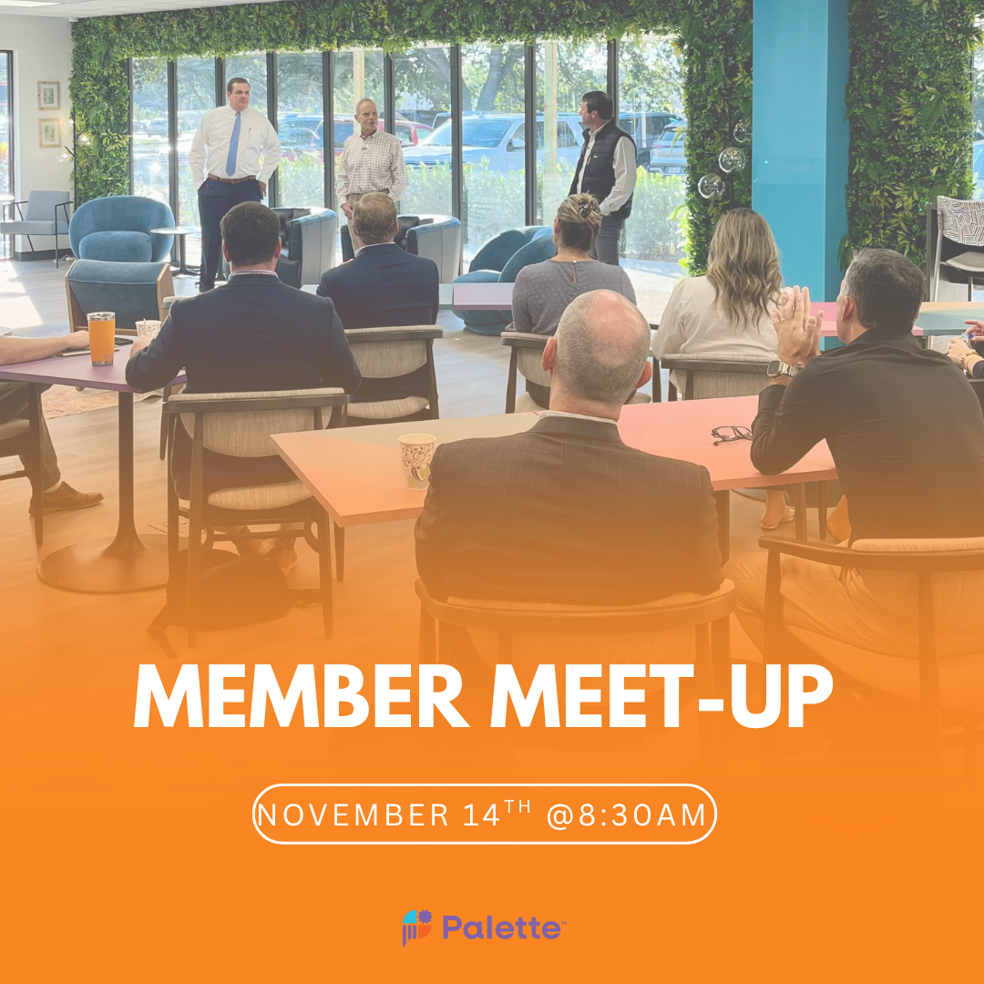 Member Meetup Friday, November 14, 2025 8:30 AM 10:00 AM Google Calendar ICS Come grab some coffee and connect with other Palette members! This casual meetup is the perfect chance to learn how to get the most out of your membership, share ideas, and hear what’s coming next at Palette.